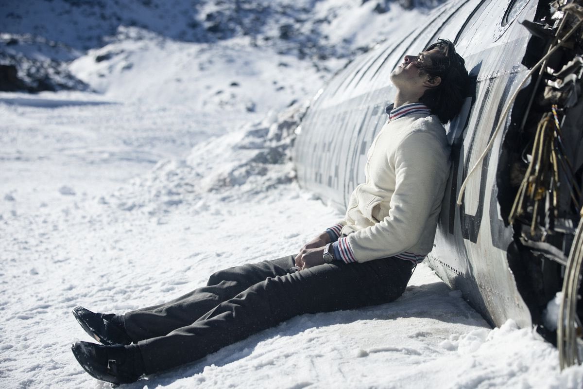 Once the dust settles, Numa emerges relatively unscathed and takes it upon himself to lead the survivors in the early days following the crash. He and his team members gather all available food items into one suitcase and construct a device that utilizes the snow as a freshwater source. Any optimism sprung from their early ingenuity is dwarfed by the towering snow capped mountains surrounding them on all sides. The film does an excellent job at showing the vast, frozen wasteland that they have found themselves in. Without any animals to hunt or even a single tree branch for firewood, the survivors might as well be on the surface of the moon. The journey over the mountain’s edge would be perilous even if they had the right gear or knew which direction is the shortest to civilization. The ever present danger of the weather alone weighs heavily on the team as they slowly succumb to the subzero temperatures. Society of the Snow steadily continues to raise the stakes as the group’s desperation grows. Rations run out and after six days without food, the survivors make their most difficult decision yet.