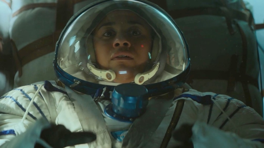 Before bearing witness to the apocalypse, Kira is introduced to her fellow scientists aboard the station. She joins two other Americans including Captain Gordon Barrett played by Chris Messina, and three Russian scientists. The whole crew gives Kira a warm welcome, each providing their own tips on how to adjust to zero gravity life. They are all working on various altruistic research projects, including a potential radiation sickness cure. On her first evening, they share songs and a few drinks, and it’s revealed that Gordon and one of the Russians, Weronika, are in a romantic relationship. This moment sets up the basic dynamics between each of the crew members and reemphasizes the team as a group of enlightened intellectuals, not restricted by the petty politics of Earth. Christian, an American scientist, tells Kira that there’s no mention of world conflicts allowed listing off Israel, Syria, and the “other one”, stopping short of saying Ukraine. This single piece of dialogue tells you everything you need to know about Christian as a character, but also the direction this story is headed. Despite their mutual politeness, there’s still that undercurrent of distrust and in Christian’s case perhaps it’s closer to distaste. Weronika takes Kira to the ship’s main viewing platform, describing the spiritual awakening many scientists experience when seeing the world without borders for the first time. It’s here that the movie really hits the audience over the head with its (inevitably ironic) aspirational and harmonious vision of humanity. Occurring right before the story sharply pivots into paranoia and murder.