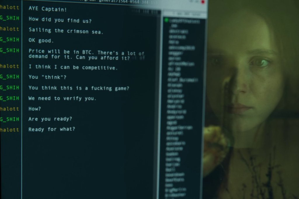 The audience (thankfully) never sees the videos for ourselves. Since the film is criticizing the exploitation of real violence for entertainment, it would be counterintuitive to the core message of Red Rooms to depict even a fictionalized version of these crimes. However, we do hear the videos. The cries for help, pleas for mercy, and tearing of flesh. We see the faces of the two women, Clementine reacting in horror and Kelly-Anne’s analytical fascination with the spectacle. It becomes clear that while Clemetine’s empathy for Chevalier was misguided, at least she actually has empathy. Contrasted with Kelly-Anne who treats the whole ordeal as a numbers game, one of her poker tournaments, what can be gained and who can be manipulated?