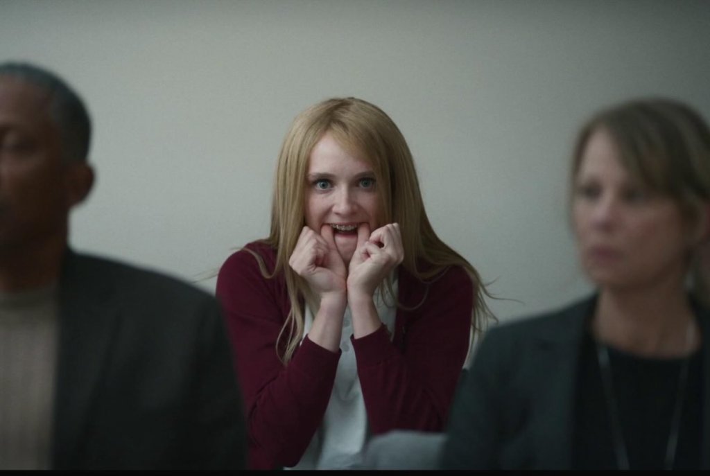 This all comes to a head in the film’s shocking final act. Unlike the other two victims, the police never located the snuff film for the youngest, Camille. However they found her bloodied school uniform and a jaw fragment with braces attached. Earlier, her mother testified in court, confirming that the items belonged to Camille. Kelly-Anne seeks out an invite only, online sale where Camille’s snuff film will be auctioned off to the highest bidder. After a close call, she narrowly secures the purchase and jumps out of her seat in bliss, smiling ear to ear. The first time she displays a recognizable human emotion. While watching Camille’s murder, she ascends into pure ecstasy. Her single minded ambition finally realized.