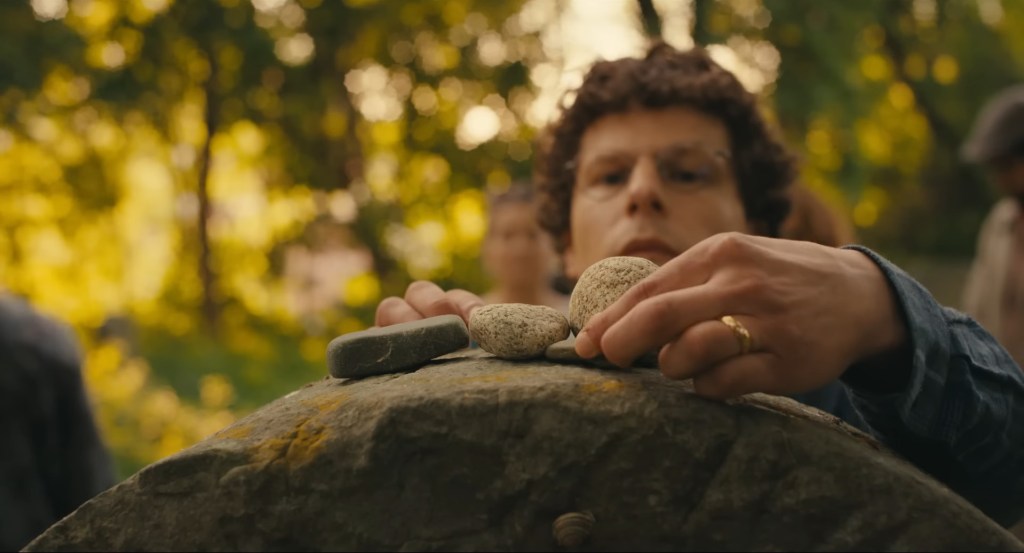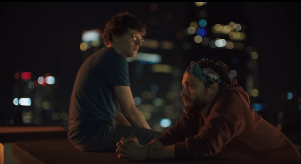 Neither David’s detached numbness or Benji’s overwhelming self pity serve them or help ease the pain of others. Both men are trapped in a perpetual state of distress, helpless against a world where tragedy is reduced to a blip on a phone screen. A passing thought before the next horror is revealed. The panic and despair take up so much space and energy within us that there’s little room for empathy or more importantly action. Eisenberg does not pretend to know the answers to the pressing issues of our time nor does he say definitively how we should channel these emotions. Instead what is offered is a change in perspective, an opportunity for us to reevaluate the only life we have and what we can do with it to alleviate the world’s suffering. Even if our efforts only provide temporary relief, even if they only help one other person. By a million little miracles, we press forward. Together.