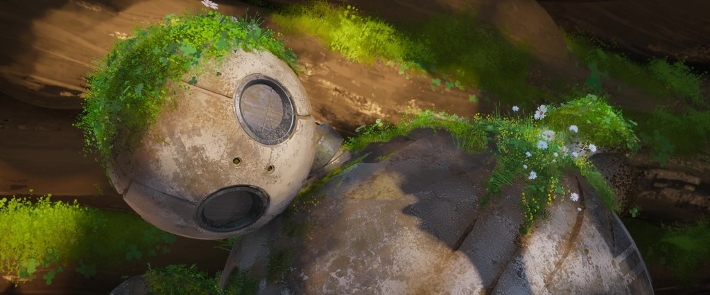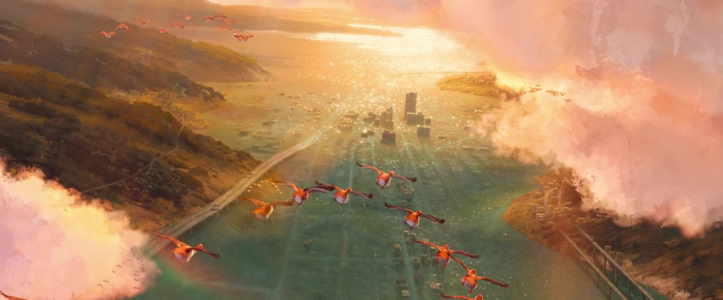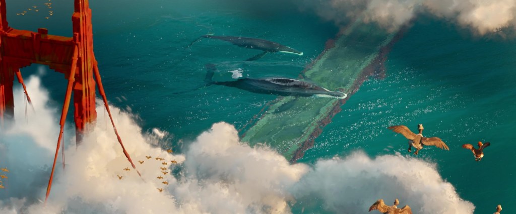 The Wild Robot’s success is in part due to how much of the story is communicated through its visual language. It’s set in a near future where autonomous worker robots are a reality, yet most of the film takes place in a remote setting. The disconnect between the natural and manmade worlds are central to understanding The Wild Robot. During the film’s pivotal migration sequence, the state of the rest of the planet is revealed to the audience in glimpses. A startling moment shows the Golden Gate Bridge partially submerged in the bay, with a pair of whales gliding past it with ease.