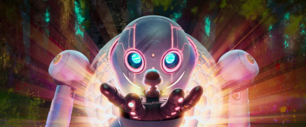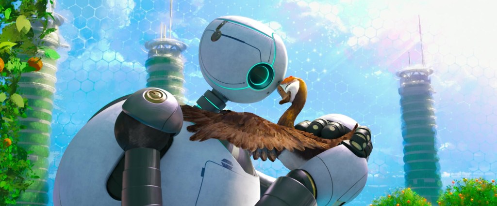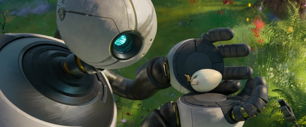 The island Roz finds herself stranded on is completely foreign to her as well. ROZZUM Units are built to complete assigned tasks, jobs provided by the humans who invented them. So what happens when there’s no humans to delegate responsibilities to her? This is something Roz struggles with early on. Upon meeting Brightbill, she determines that her task is to properly raise the gosling to adulthood. A task that it is not easy to define so with the help of Fink, she breaks it down to three achievable steps. However, this job is unlike anything she was programmed for. Roz is not equipped with the ability to respond emotionally, at least not in the ways that parenthood demands. She surprises herself in moments where she becomes protective over Brightbill, even fearful of the journey ahead which he must make alone. Nothing in her code instructs Roz to develop these feelings, yet she does anyways.