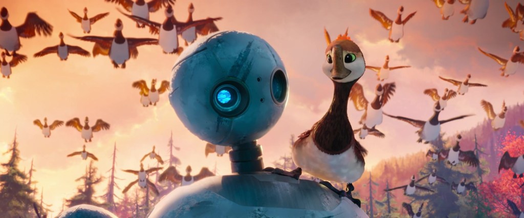 A hungry fox named Fink, played by Pedro Pascal, has other plans however. The two battle it out for the unborn goose, with Roz eventually claiming the egg for herself. Upon hatching, the gosling, named Brightbill, imprints on her, treating Roz as his new mom. Realizing that the naive robot can be manipulated into providing him food and protection, Fink forms an unlikely friendship with Roz and assists her in raising Brightbill. In order for Roz to complete this new task, she needs to ensure that Brightbill is able to eat, swim, and fly, the essential skills every adult goose needs. But parenthood is more art than science, proving difficult for Roz who was not programmed with these skills in mind. The found family dedicates their time to ensuring Brightbill is ready for the upcoming migration. However, this bond is threatened when Brightbill discovers that Roz is accidentally responsible for the death of his biological family.