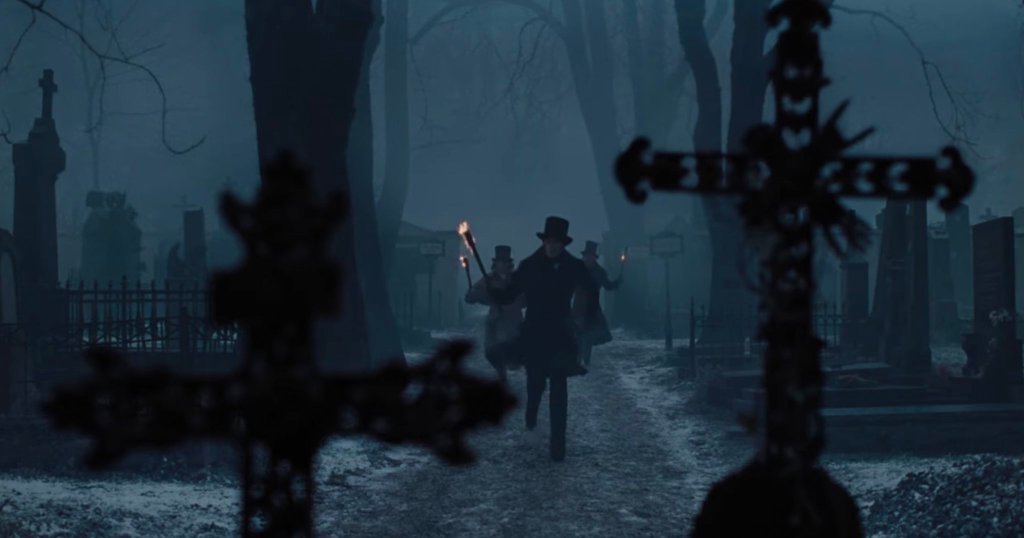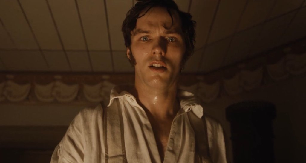 When we first encounter the vampire, he is completely in shadow. We see his gnarled fingers and lifeless eyes in close ups, but the creature does not fully reveal himself to us. Most of the fear in these scenes is conjured through long takes on Hoult’s horrified face. We perceive the danger directly in response to his fear, letting our imaginations run wild with disturbing imagery. It is the kind of performance that is successful because it does not draw too much attention, letting the scenes speak for themselves. A teary eye and shaky voice is all you need to understand Thomas’s state of mind. It’s incredibly effective at both driving the film’s steady pulse of dread and delaying the inevitable full creature reveal. The unknowable threat is more formidable.