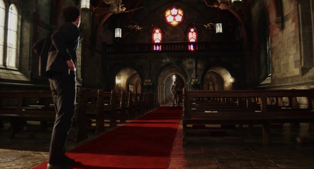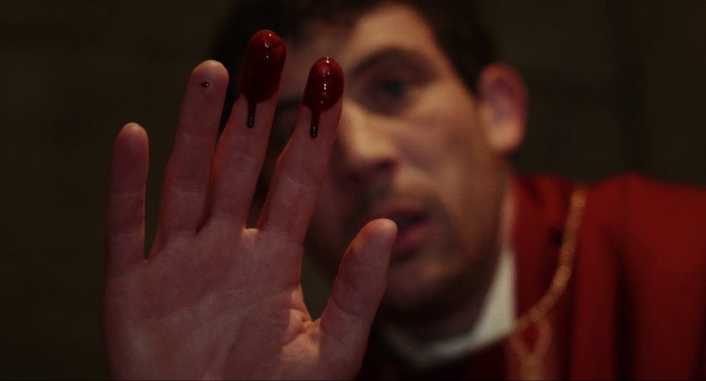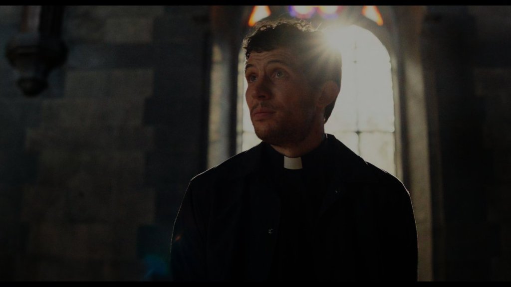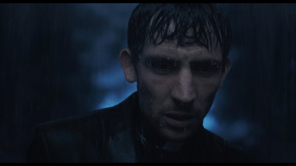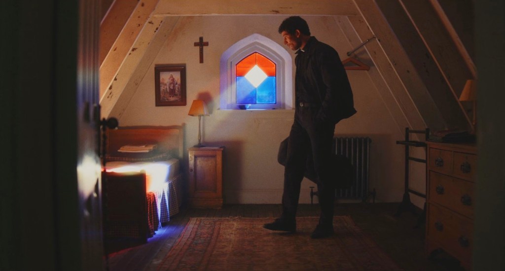 Aesthetically, this is the most visually pleasing of the current trilogy. This is primarily due to its Catholic church setting and religious themes. The imagery is sharp, specific, and haunting, reflecting the deterioration of this singular community in the hands of a corrupt Monsignor. Crumbling neo-gothic architecture, shadowy crypts, and medieval stained glass scenes of betrayal, guilt, and redemption punctuate Father Jud’s crisis of faith and Benoit’s agnostic frustrations.